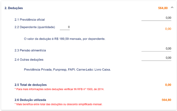 As deduções correspondem a dependentes para fins de IR, pensão alimentícia, entre outras, conforme determina a Instrução Normativa RFB nº 1500. Além disso, caso o total das deduções seja inferior ao desconto simplificado previsto na IN RFB nº 2141, atualmente fixado em R$ 607,20, ele prevalece sobre outras deduções do participante. Por outro lado, se as demais deduções forem superiores, estas devem ser consideradas.