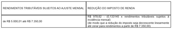 - Rendimentos entre R$ 5.000,01 e R$ 7.350,00: aplica-se a fórmula para redução no imposto de renda: R$ 978,62 – (0,133145 x rendimentos tributáveis sujeitos à incidência mensal), de modo que a redução seja decrescente até zerar para rendimentos a partir de R$ 7.350,00.