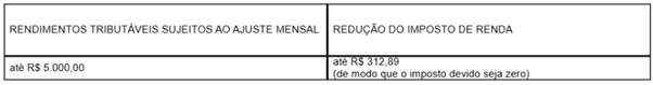 - Rendimentos até R$ 5.000,00: aplica-se uma redução no imposto de renda de até R$ 312,89, de forma que o imposto devido seja zero.